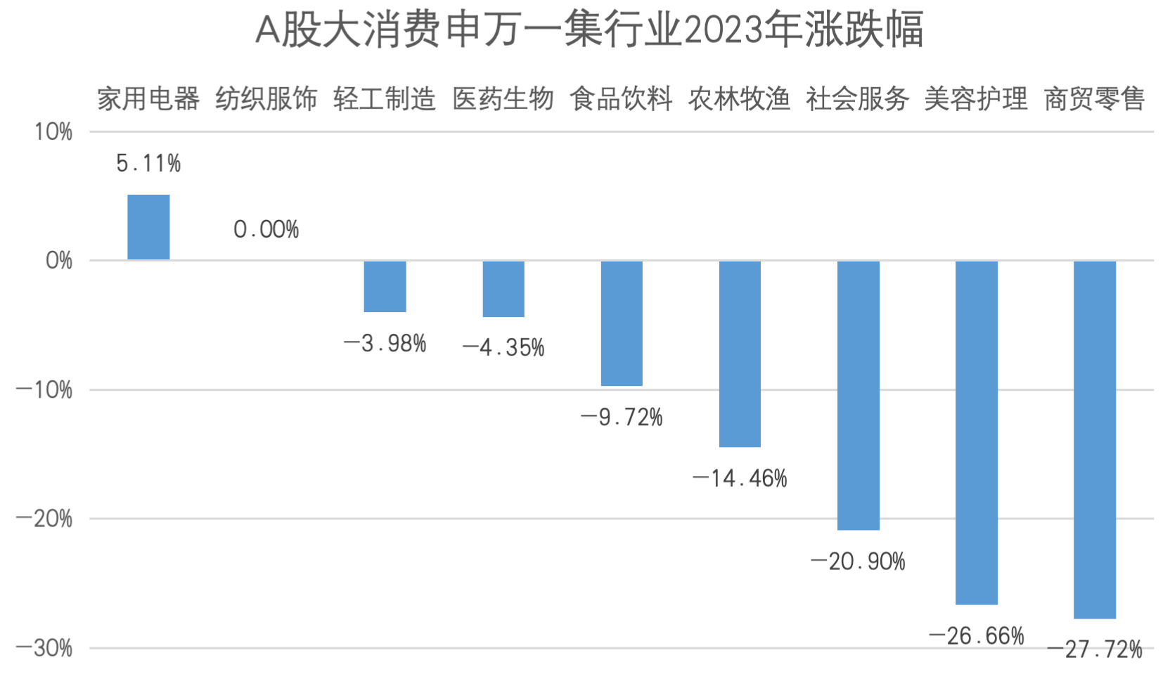 2023-11-14 10:49:15距離2023年結束還有不到兩個(gè)月,消費股已經(jīng)描繪出了大致的成績(jì)單:Wind消費指數(888013.WI)和恒生消費指數(HSCGSI.HI)年初至今分別下跌了10%和23%。其中,作為A股權重最大的板塊,食品飲料行業(yè)的表現并不出眾,表現遠遠落后于家電、紡織服飾、輕工制造和醫藥生物。